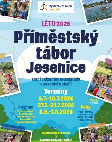 Oblíbený příměstský tábor Jesenice bude probíhat v Jesenici u Prahy a blízkém okolí.