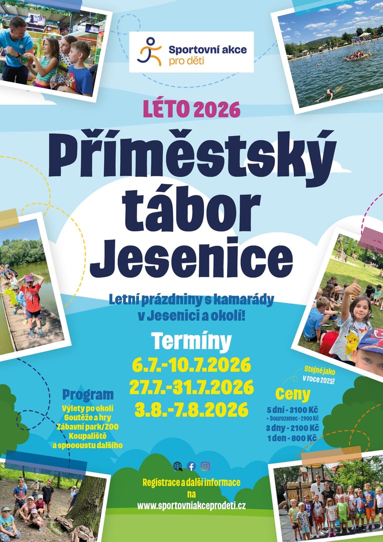 Léto v Jesenici? Jedině se Sportovními akcemi! Čekají vás nejen výlety po okolních zajímavých místech, parcích a atrakcích, ale vydáme se také na zájezd! V loňském roce jsme navštívili Farma park Soběhrdy nebo čestlický park Žirafa! Prostě nuda u nás nemá šanci.